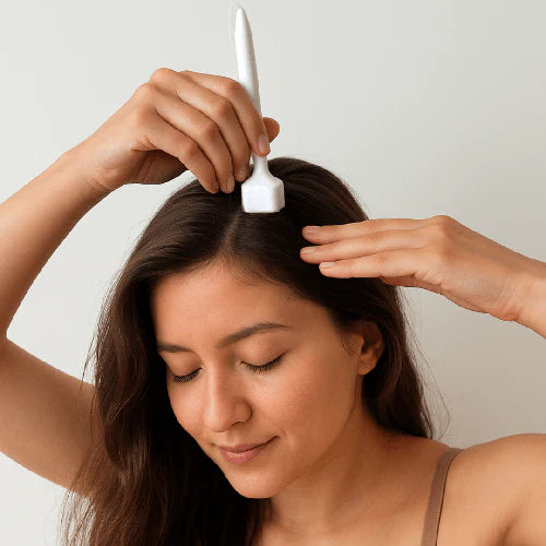 The DermaGlow DermaStamp uses fine microneedles to gently stimulate blood flow and awaken dormant hair follicles. This primes your scalp to absorb nutrients more effectively for stronger regrowth.